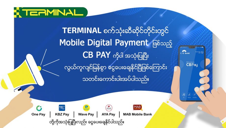 Cash အပြင် Mobile Digital Payment ဖြင့်ပါ အဆင်ပြေပြေ ငွေပေးချေနိုင်ဖို့အတွက် Terminal စက်သုံးဆီဆိုင်တိုင်းတွင် Mobile Digital Payment ဖြစ်သည့် CB Pay ဖြင့်ငွေပေးချေနိုင်ပြီဖြစ်ကြောင်း သတင်းကောင်းပါးအပ်ပါသည်။